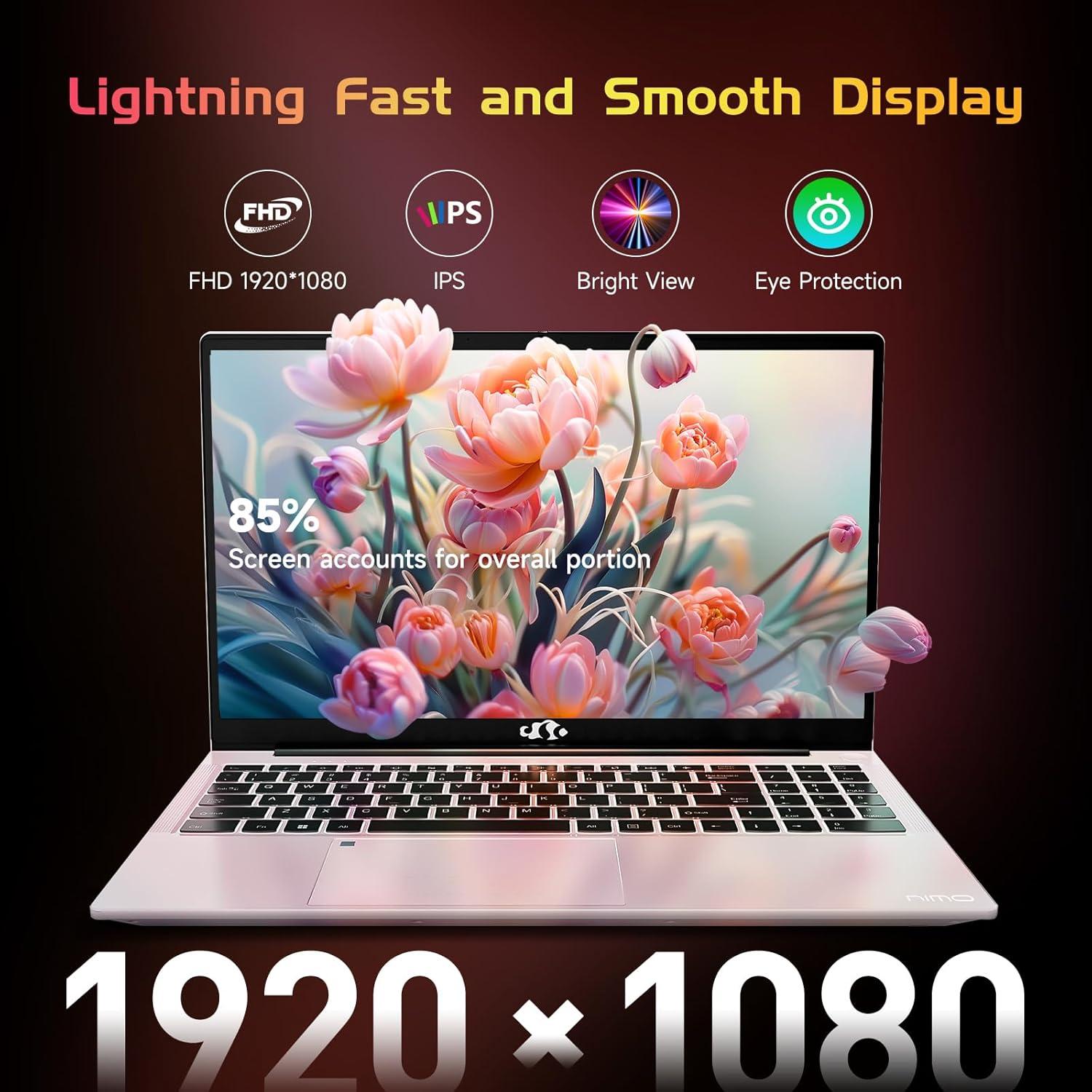 【15.6 FHD IPS & Fingerprint 】This 15.6-inch NIMO laptop features an innovative thin-bezel display, offering more onscreen space for an immersive FHD viewing experience. The design allows for a larger screen to fit into a more compact chassis, making the laptop more portable. With the built-in fingerprint sensor on the touchpad, there's no need to type your password—just a single touch is all it takes.