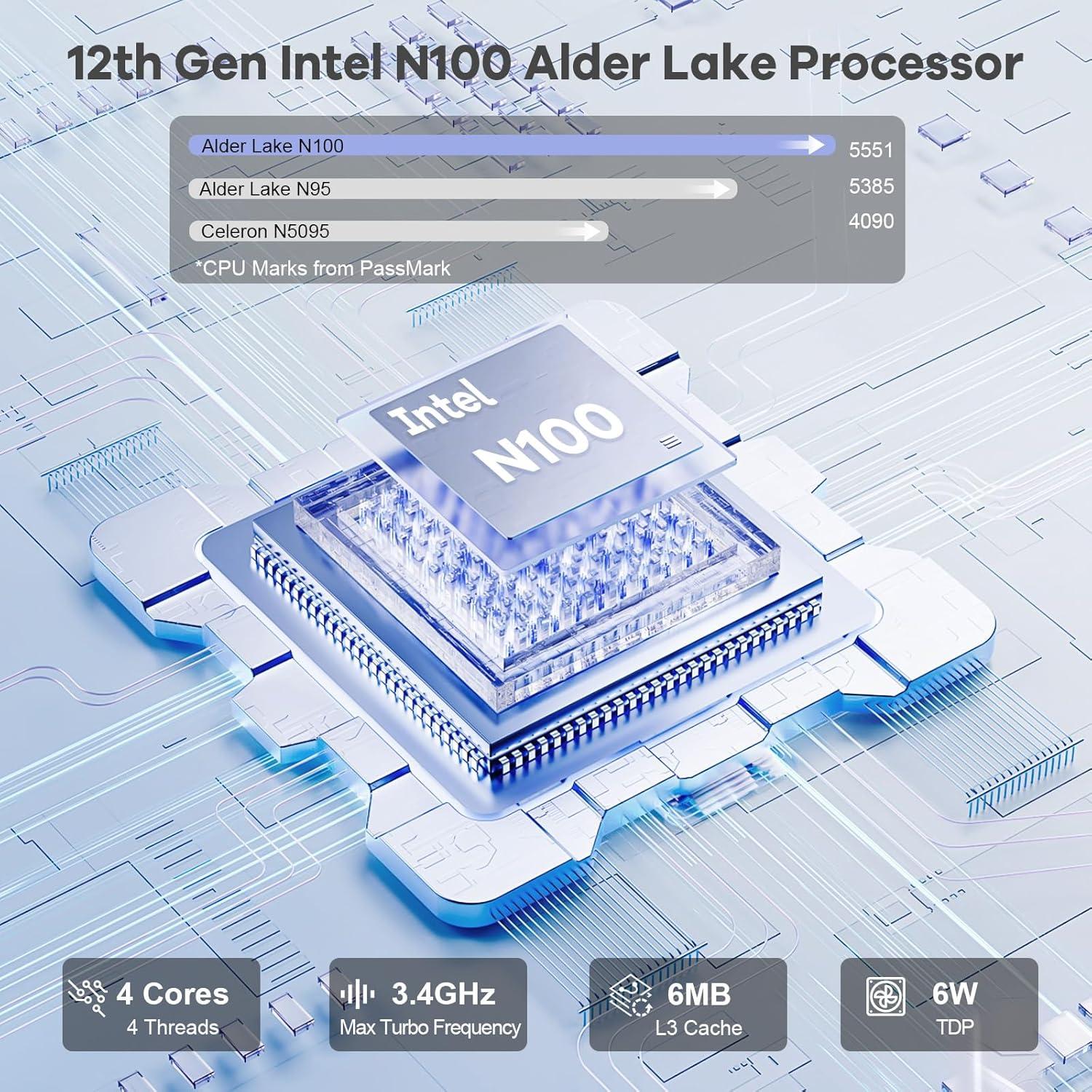 【The Latest Generation Intel CPU】Mini PC Desktop features the newest 12th Gen Intel N100 CPU cores with a maximum of 3.4 GHz. Its multi-core design ensures a smooth operating experience when multitasking, and the integrated Intel Graphics supports modern graphics technology standards. Moreover, the CPU of Mini PC Desktop provides basic computing power while significantly reducing the device's power consumption and heat generation, increasing battery life to last a long time.