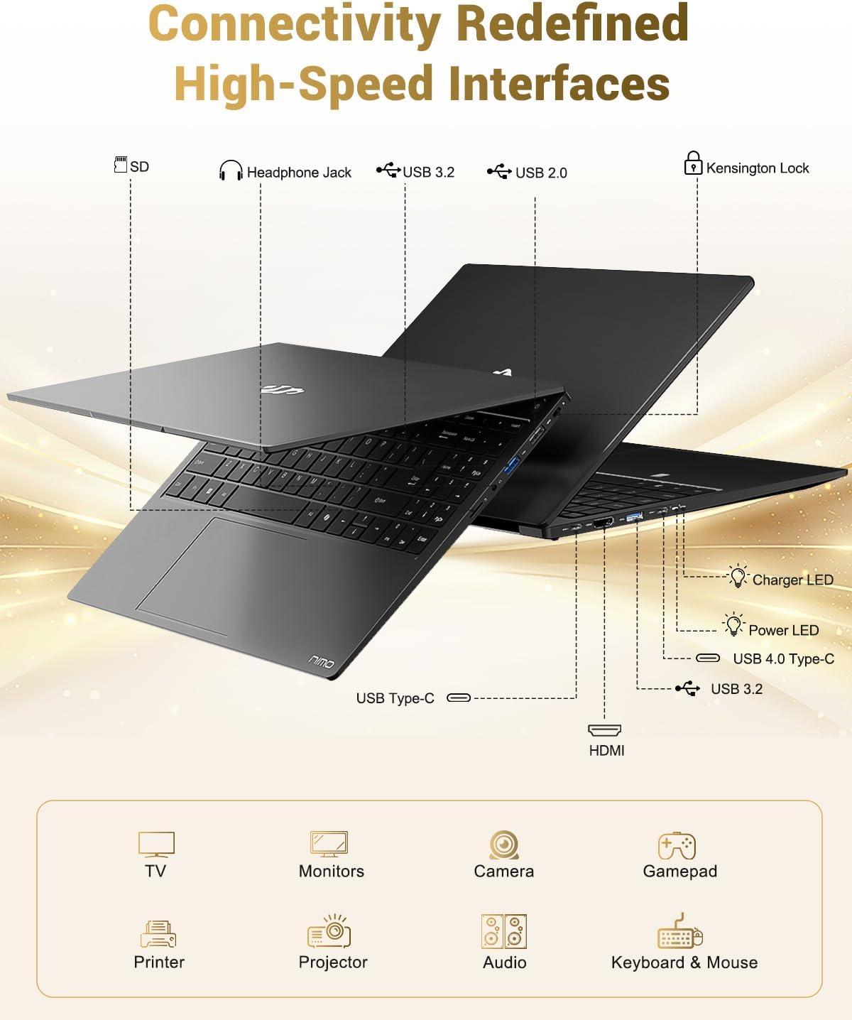 【Premium & Upgradable Design】The NIMO laptop features 64GB of DDR5 RAM and a 1TB PCIe 4.0 SSD for blazing-fast speeds and multitasking. Its user-friendly, upgradable design lets you expand memory and storage effortlessly. Encased in a durable metal shell, it combines robust performance with premium aesthetics that will grow with your needs.
