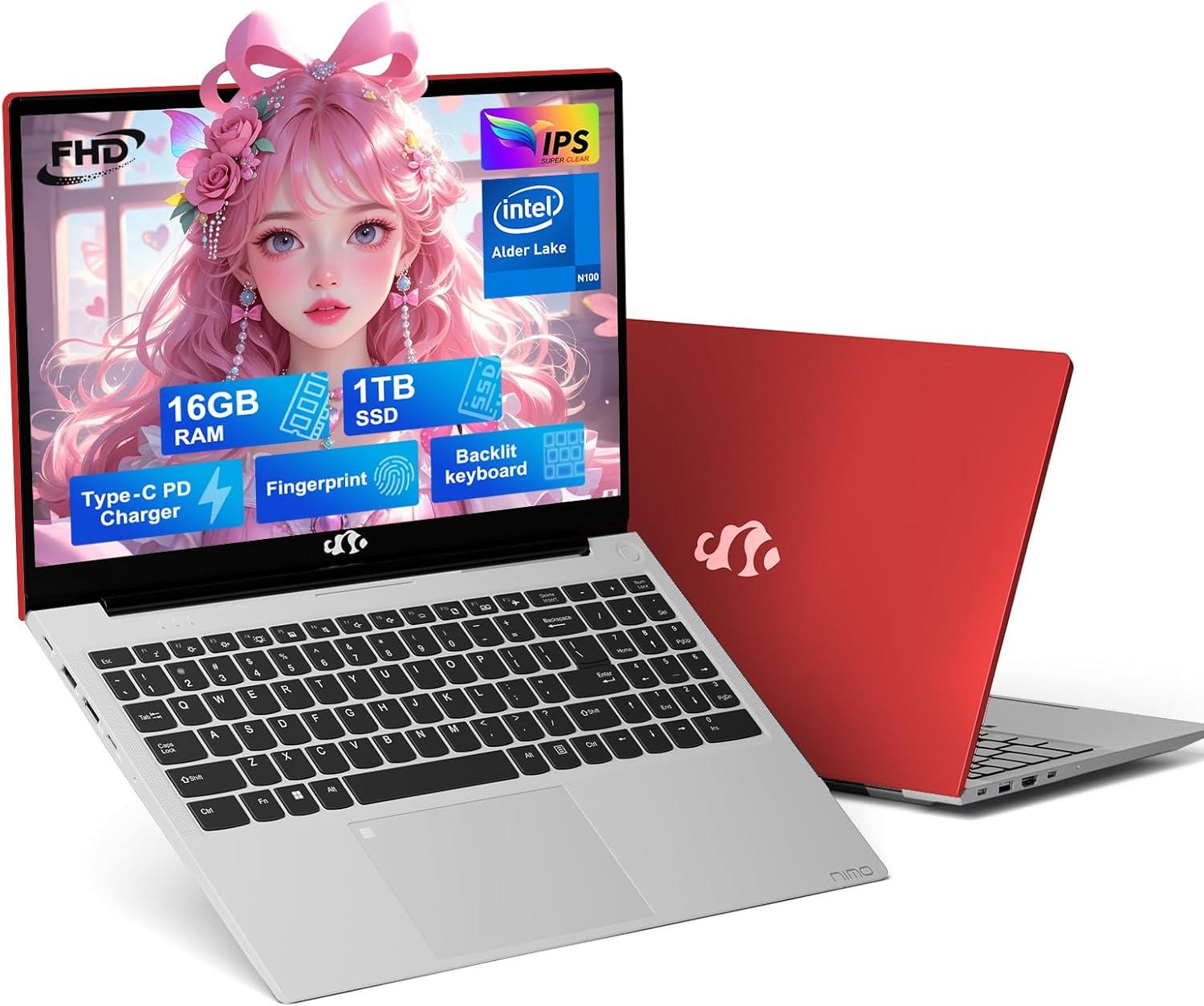 NIMO 15.6 IPS FHD-Laptop, 16GB RAM 1TB SSD Intel Pentium Quad Core N100, Computer with Backlit Keyboard Fingerprint (Beat to i3-1115G4 Up to 3.4GHz) Laptops for Student, Win 11 Blue(Red)