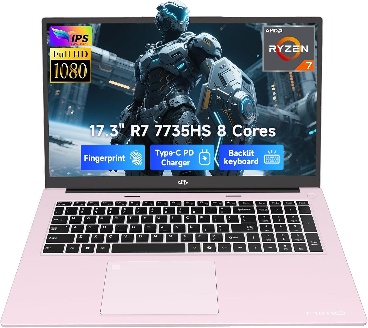 NIMO 17.3″ Gaming-Laptop, AMD R7 7735HS (8C/16T, Beats i7-12650H) 16GB DDR5 RAM 512GB SSD Computer with Radeon 680M, 100W Type-C, Wi-Fi 6E, 75Wh Battery, Fingerprint, Backlit Keyboard for Business(Rose Gold)